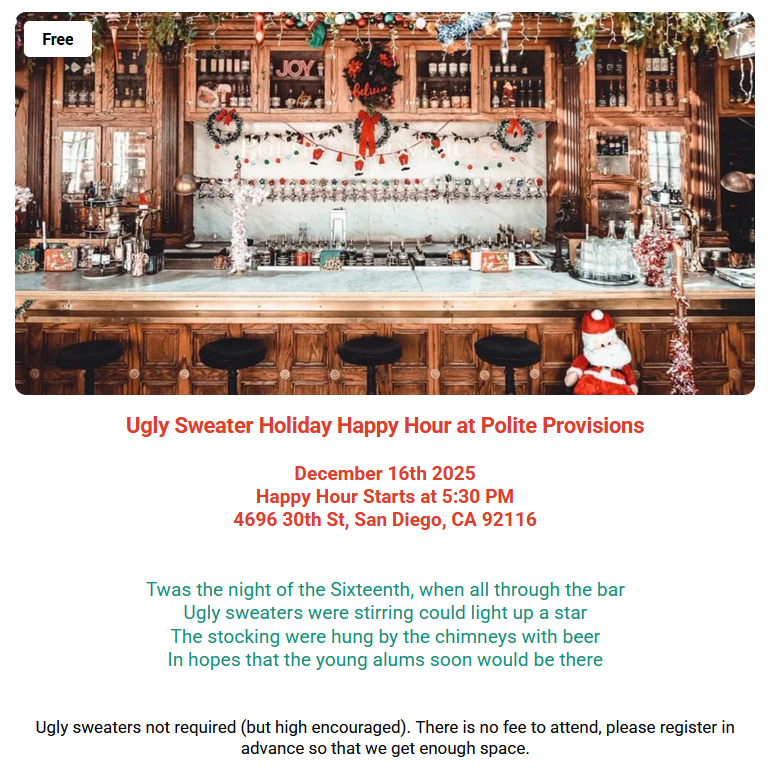 Ugly sweaters not required (but highly encouraged). There is no fee to attend, please register in advance so that we get enough space. To RSVP: MIT10 | Ivy+ Young Alums Ugly Sweater Holiday Happy Hour | MIT Alumni Association